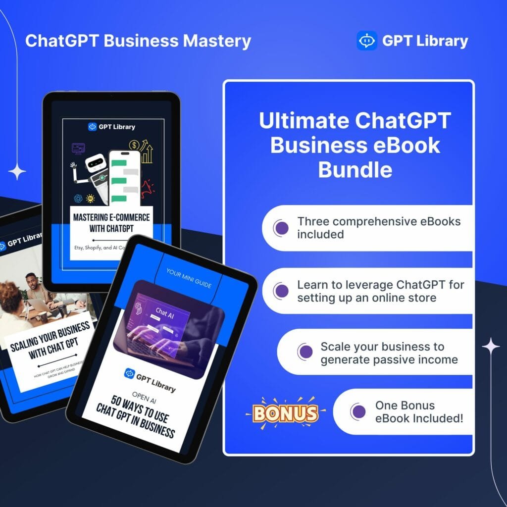 Transform your business with the “Ultimate ChatGPT Business Mastery eBook Bundle,” featuring AI tools and strategies for success. Includes “50 Ways to Use ChatGPT,” “Scaling Your Business,” “Mastering eCommerce,” and a bonus “Mini-Guide To Using DALL-E.” Perfect for entrepreneurs and marketers.